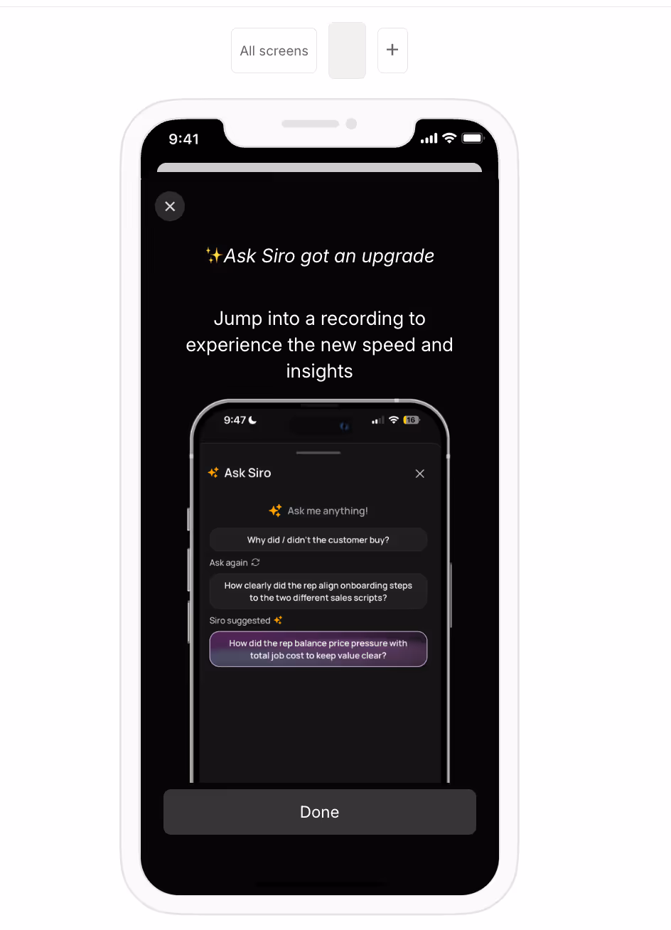 Siro’s first step is to scale the sales manager by recording their reps’ sales conversations, analyzing them, and surfacing the most coachable moments from them to their Siro inbox - making coaching as easy as responding to a text message.