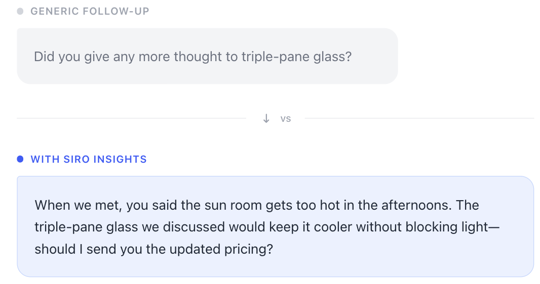 Siro turns in-home conversations into personalized follow-up gold, using real insights to craft messages that actually land.